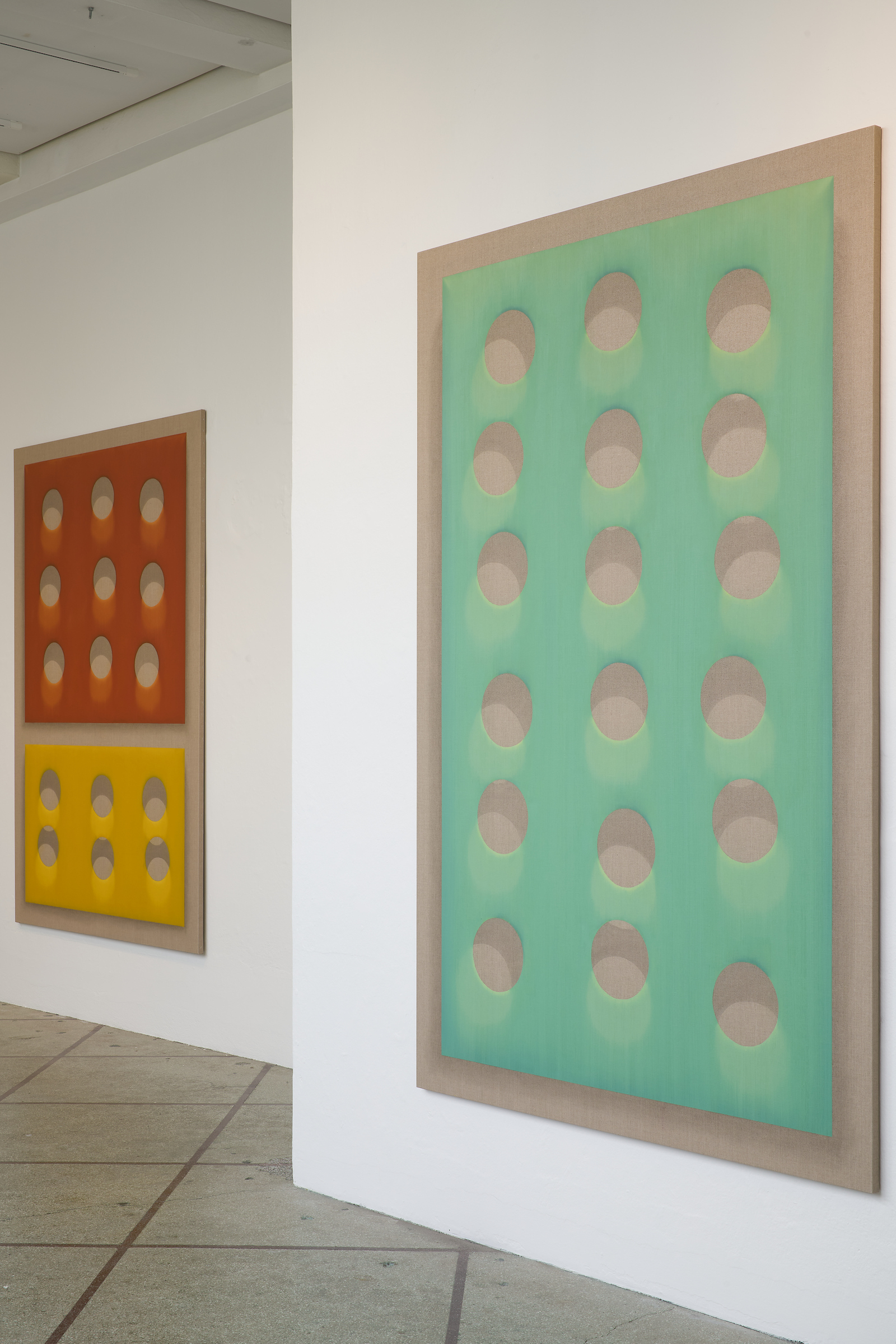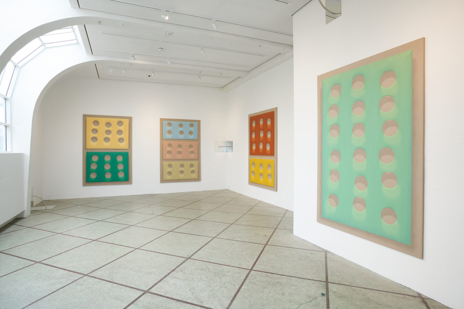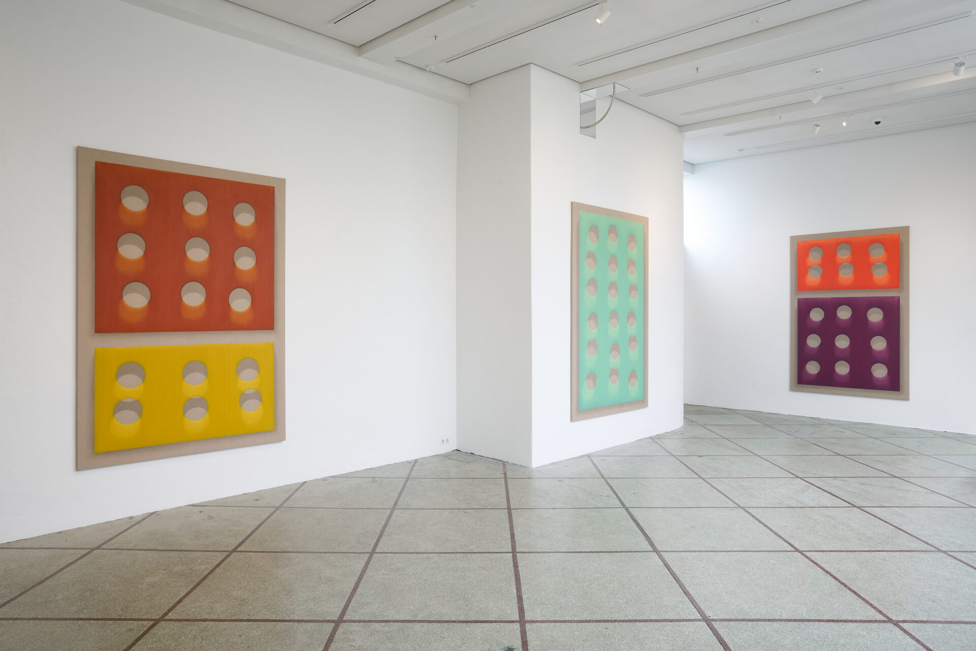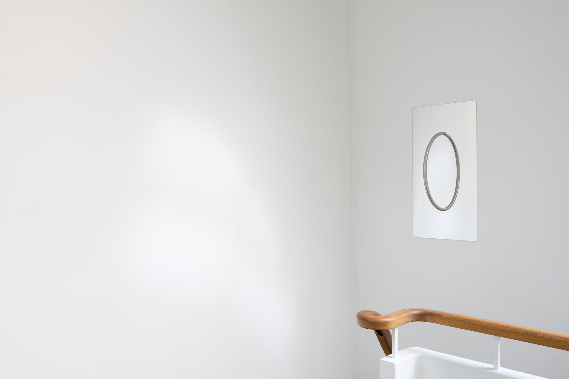 In Litarek, his new exhibition at Ásmundarsalur, we see large paintings where he once again exposes the space between paint and canvas, this time dividing the surface into fields of colour that seem to float above the canvas instead of blending into it. Especially striking, however, are the new works where he uses mirrors and metal pipes, bent to form sections of a circle. The mirrors reflect the space and a part of the circle — but inside the mirror, strangely enough, the circle becomes whole. The reflection shows the real space around us, but also something that doesn’t exist in the real world, a kind of addition to reality that only exists in the mirror — just like the spaces that Sigurður Árni conjures in the shadows of his work that live in the viewer mind. And then again: perhaps, as Borges suggested, these are all just aspects of our lived universe.