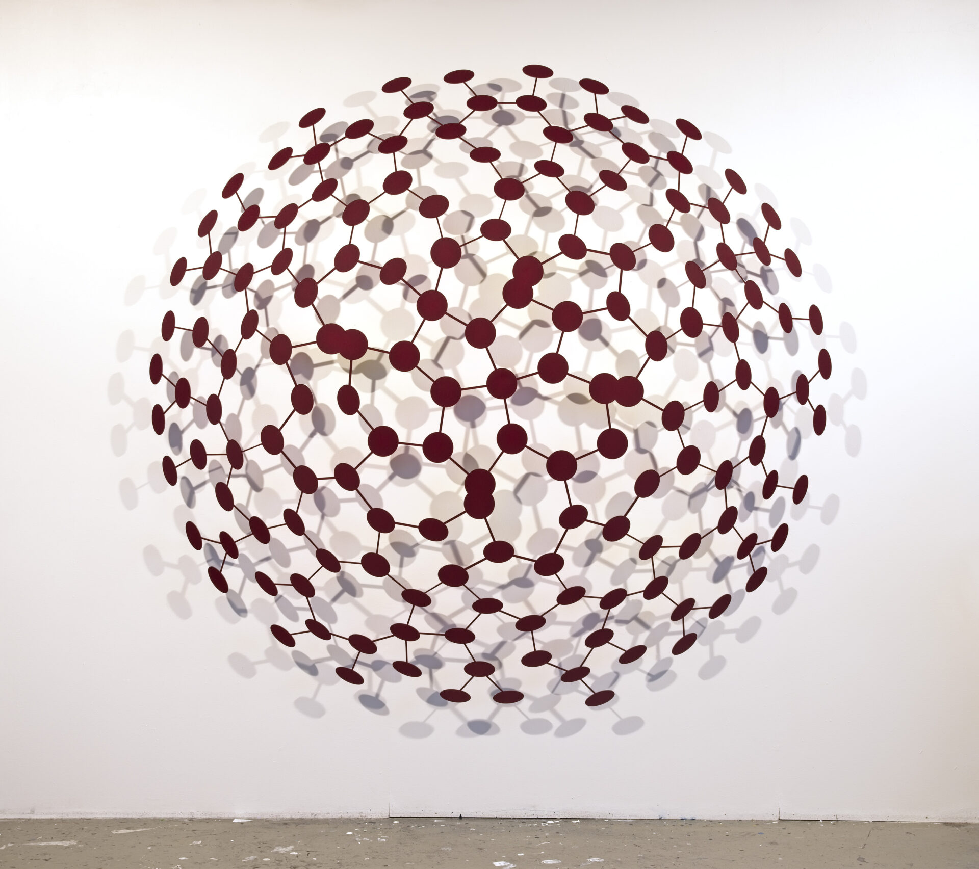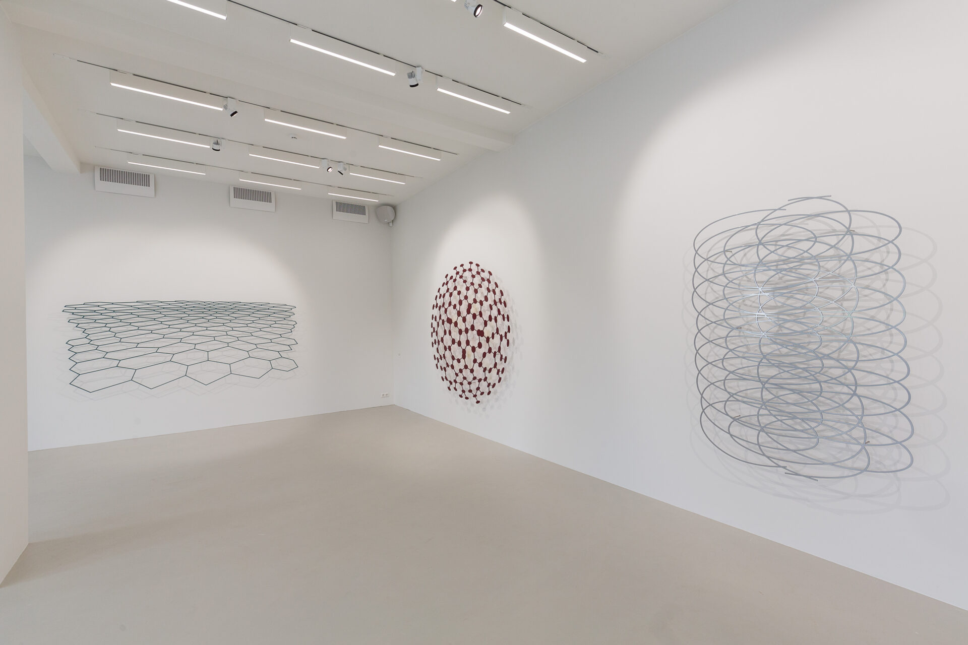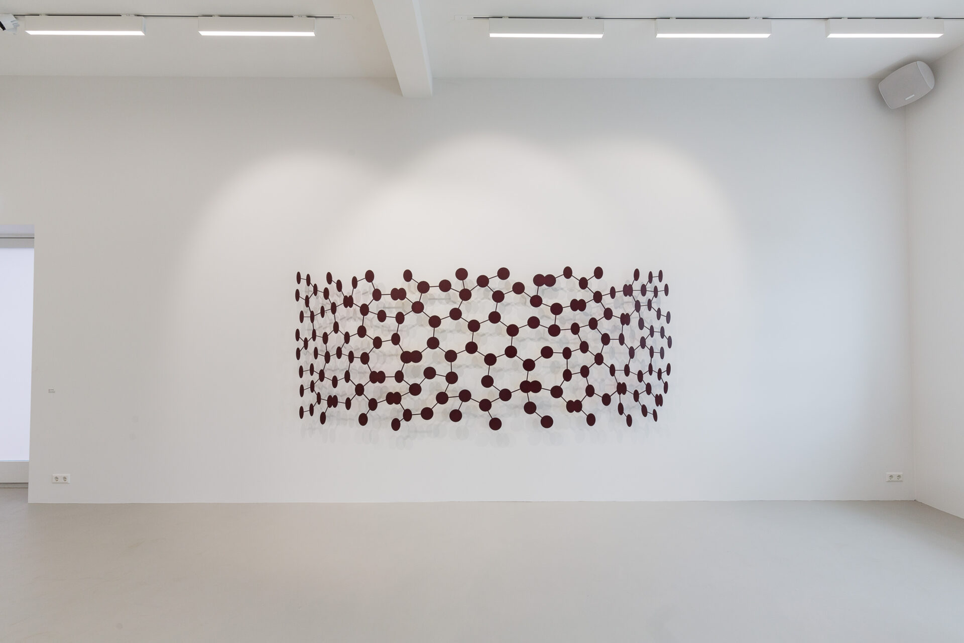 These works arouse a feeling for a vast, limitless space with no actual center or special visual importance. The recurring shapes seem to be able to expand in any direction, without being restrained by a frame or other external borders. This is emphasized by placing them as if floating in the air. The works do not contain a visible order, though they indeed form some kind of a pattern. Familiar ideology comes to mind, on inherent instability of both language and meaning. Late in the twentieth century, scholars started referring to the concept of root systems “rhizomes” and existentialism, instead of center or core. One could say that with these works, Sigurður opens various visual portals into the worlds of materialism and idealism.