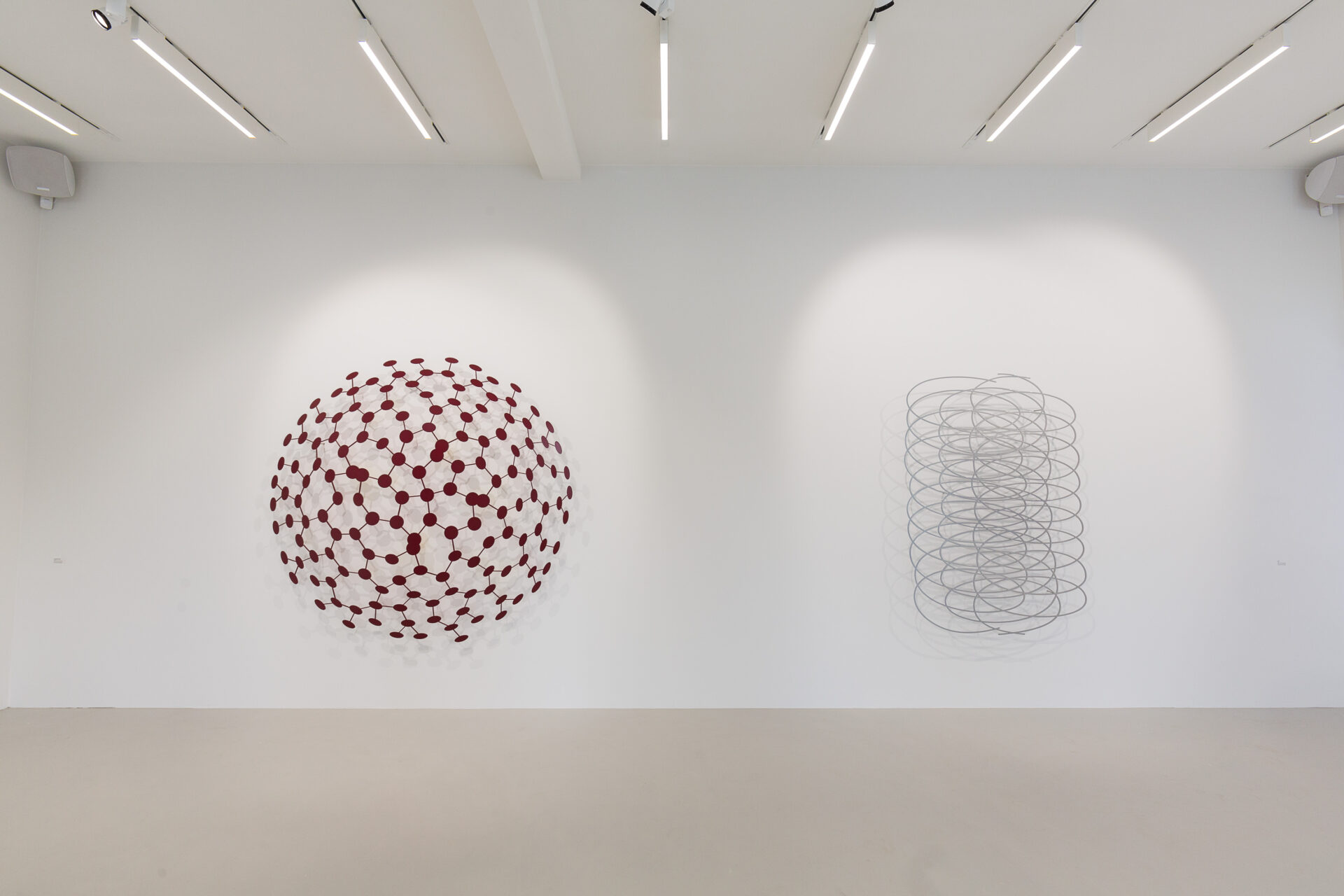 At first glance, Sigurður’s reliefs seem to be made out of found material, shapes derived from natural or digital models, cast in a mold and covered in pigment, a process similar to a manufacturing industrial products. A closer look reveals that the framework are abstract drawings by the artist, processed in a way that almost eradicates the human touch. Some of the reliefs are based on Voronoi diagrams; a natural algorythm to be found all around us. The Russian mathematician Georgy Voronoi defined the system in the 19th century: It explains how a plane partitions in the weakest place between two points. This is the form and structure of columnar igneous rock, stone polygons, a giraffe’s pattern etc. Voronoi diagrams are to be found in the smallest particles of substance matter as well as in cosmic dimensions of the universe. The same applies to the spiral, or the helix, presented in Sigurður’s works. It has a similar absolute value found in nature on various scale in the world. Voronoi diagrams and helixes both refer to infinity.