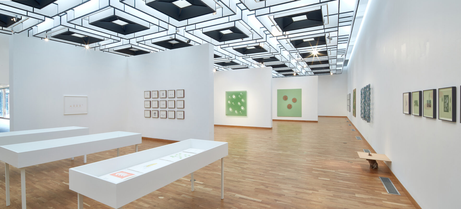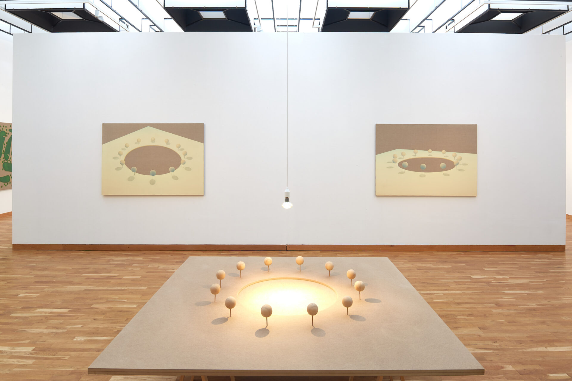 If in the case of these mural sculptures, the shadow actively participates in the suggestion of volume, it is the void, the excavation, the hole, which forms the strongest relationship Sigurðsson engages in with his work. A piece from 1993, Perfect Garden, the first version of the garden imagined in the two paintings of the same title, clearly sheds light on that relationship. A garden is represented in three dimensions here in the form of a model. Spread across the view, along three circular arcs, are fourteen trees, spheres on stems, which have been coloured in green out of representative concerns. Basins seem to have been placed at the foot of each one, not so much to collect water as the shadows projected by the trees, thanks to a lamp fixed to one of the edges of the board. The shadow is in the hole. The shadow is a hole.