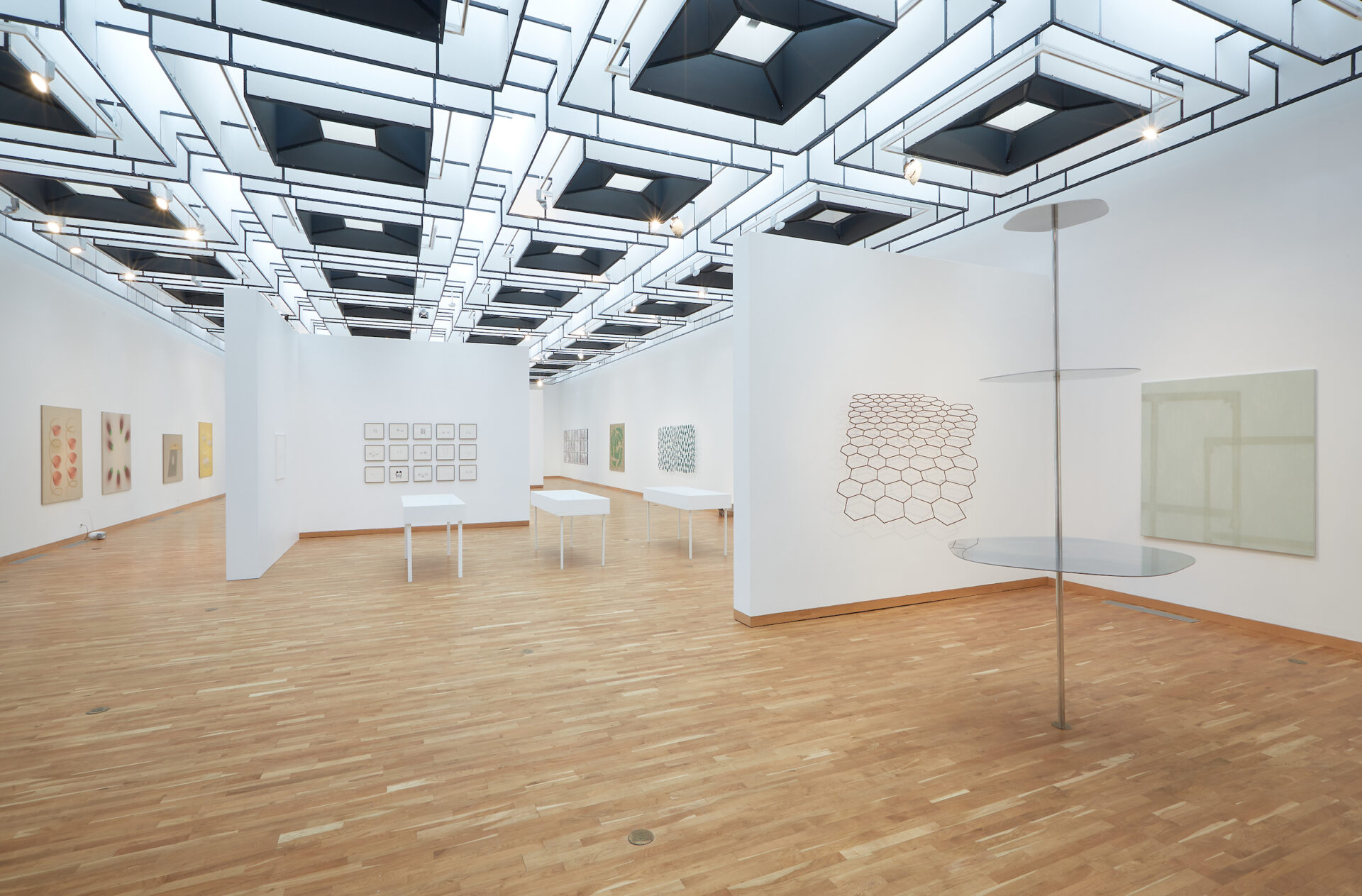 Sigurðsson’s interest in cast shadows does not only manifest in their representation on canvas. Several of his works functionally incorporate the shadows which they project on the wall where they occur. This is the case in the canvas stretchers, like those that have long been used by painters, except that these are in coloured Plexiglas, which the artist is working on as this text is being written. There is no need to stretch a canvas on this stretcher to produce shadows, since it projects them itself. Other works do the same, such as his painted aluminium pieces, Tenging (Connection, 2017) and Rautt Samhengi (Red context 2018), which are founded on the molecular pattern already mentioned. These mural structures, even more than the shadows they cast, are noted for the optical illusions they create. Even though they are flat, they convey a sensation of volume thanks to the use of the laws of perspective. And the depth effect obtained in this manner is further reinforced by the shadows spread across the middle distance and the various nuances of grey which it regales the eye.