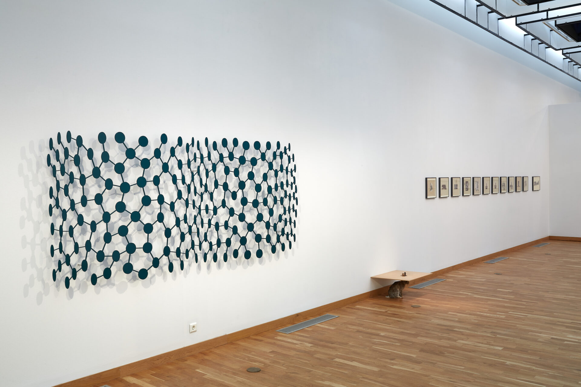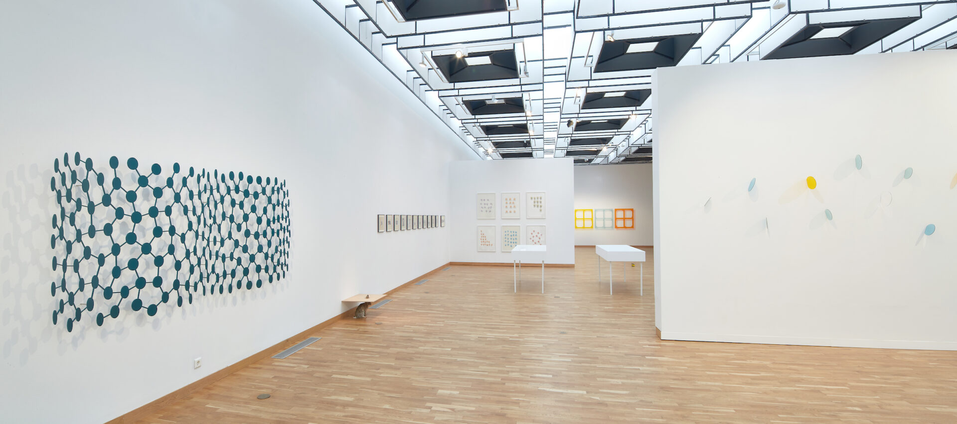 The tendency towards schematised representation starts to clearly manifest itself in Sigurðsson’s work with the introduction, at the beginning of the 2000s, of the motif of the molecule. One of the most common conventional ways of representing a molecule is to depict the atoms as spheres or disks and the links between them as lines. In 2000, the artist made two paintings, one blue and the other orange, both of which are given the eloquent title of Molecule for canvas. The two molecular structures differ from each other. They are not a far cry from the perfect garden, not only because their representative mode is not very distant from that of the molecule, but above all because the image of a plant seems to have served as the transition between the two. In 1996, Sigurðsson made an oil painting on cardboard representing a tree with a bending trunk, which distributes its leaves in space a bit like the molecules of an atom. In the same year, a painting called The Kenya tree presents, at the end of its branches, several slightly rounded disks, which also foreshadowed the figuration of atoms to come. Once the molecular motif is introduced into his work, it becomes very fertile. As early as 1999, it is used in the twin paintings called Continental Drift. From the sphere of plants to the physics of drifting or shifting tectonic plates, molecular forms possess a great representative aptitude in Sigurðsson’s work. They can even exist in three dimensions, such as the large aluminium wall reliefs from 2017 and 2018 ‒ in which dozens of atoms are assembled.