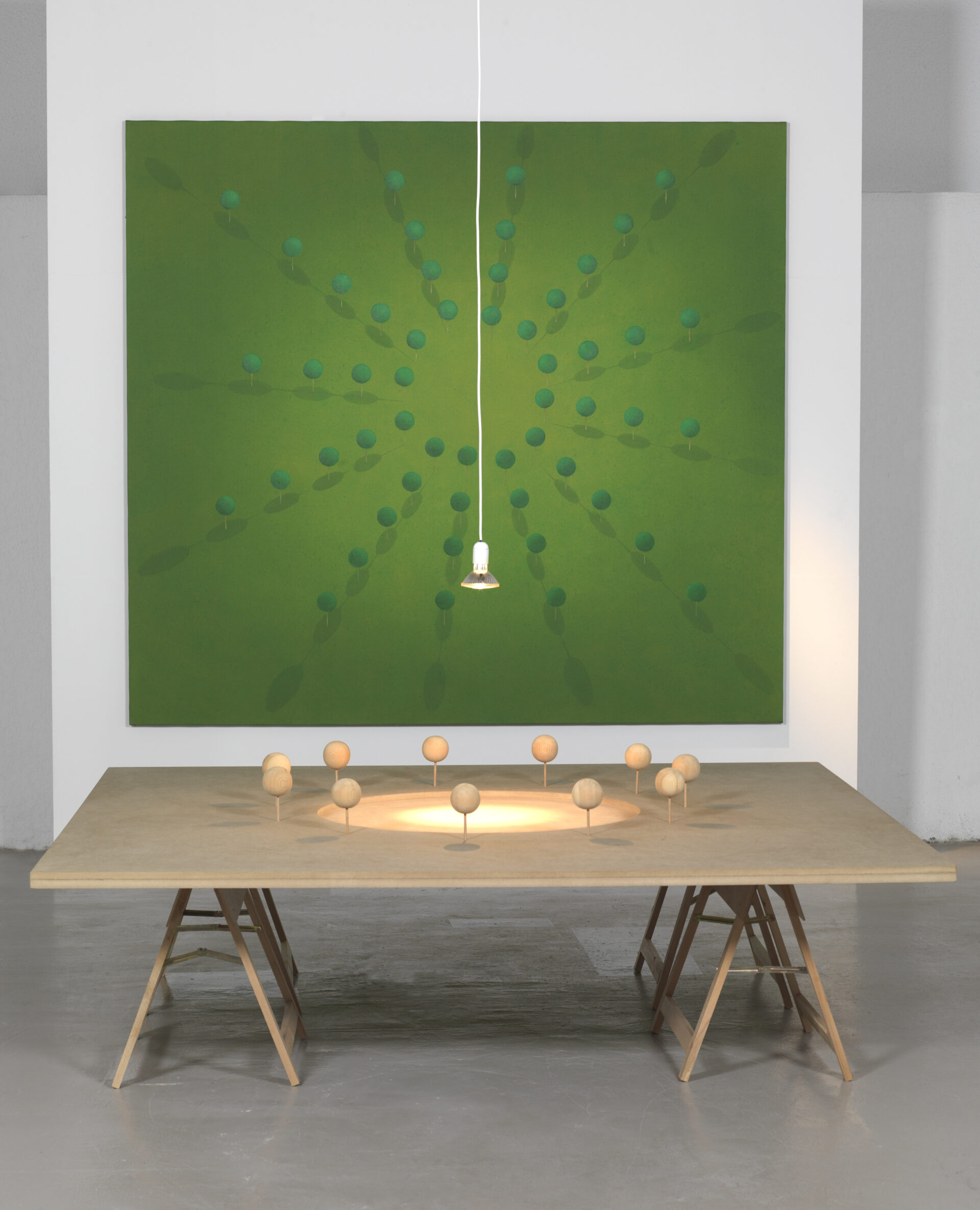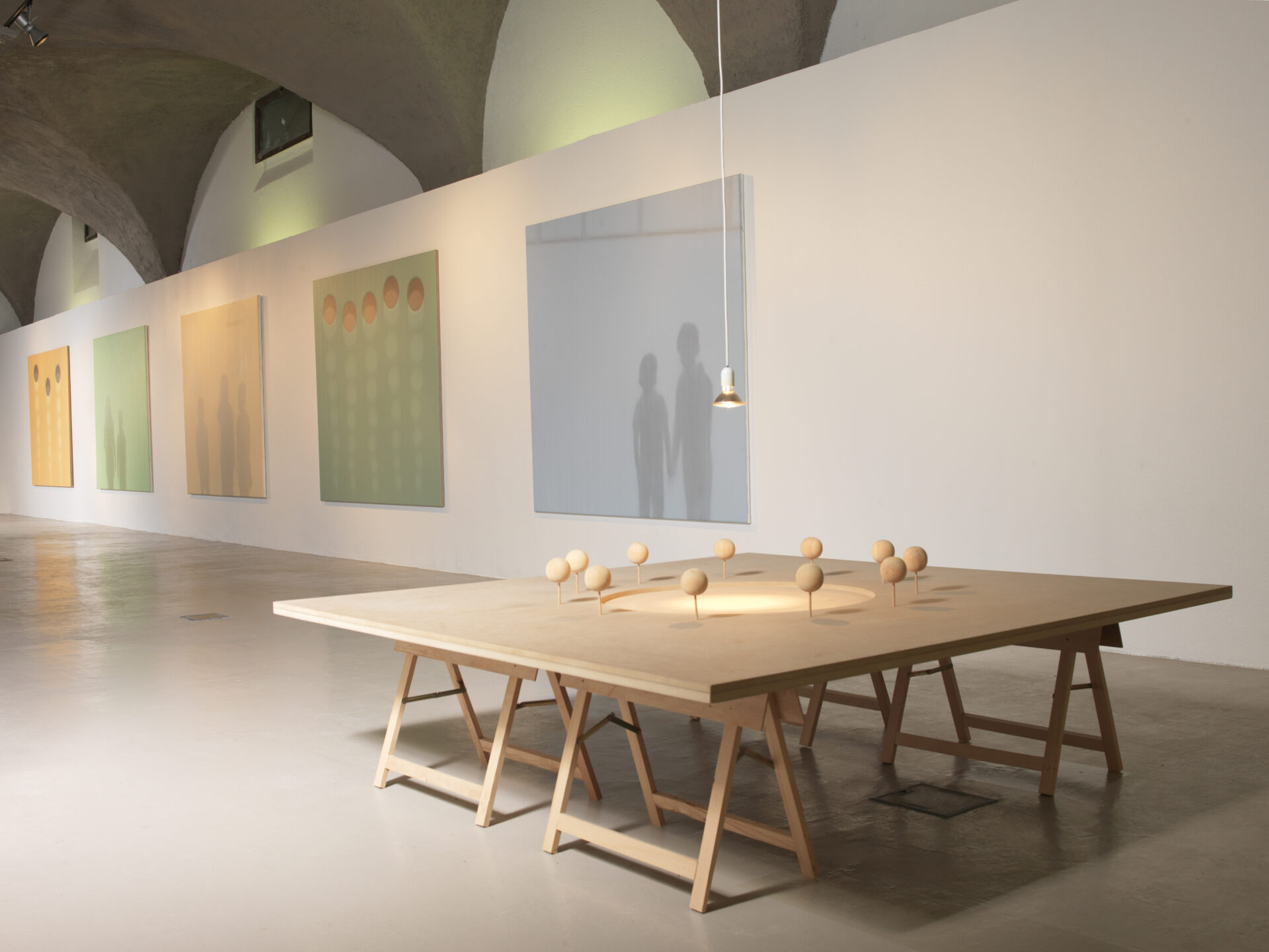Sigurdur Arni Sigurdsson peint, dessine, construit sans donner d’indices sur l’origine de la perspective. C’est un monde vers un autre, une distance inédite, intermédiaire entre la plongée cinématographique et une vision de satellite, qui comprendrait la terre. On est bien encore à l’intérieur du système solaire mais déjà perdus. La question du point de vue est aussi présente dans les paysages que les peintures d’ombres de silhouettes. Où sont ces gens? Nous précèdent-ils ou nous font-ils face? Et dans quel état de la vie? Adolescents dans l’âge de transition trouble et merveilleux? Souvenir ou pressentiment, il s’agit d’un autre ordre en tout cas. Si On sait qu’il est possible de manipuler les ombres pour faire apparaître des choses qui ne sont pas là(3) on sait aussi que l’ombre est le signe de la présence, un effet de sa radiance. Le diable n’en a pas et Peter Pan ne veux pas abandonner la sienne. Elle rend tangible son existence magique et Never Land avec lui.
